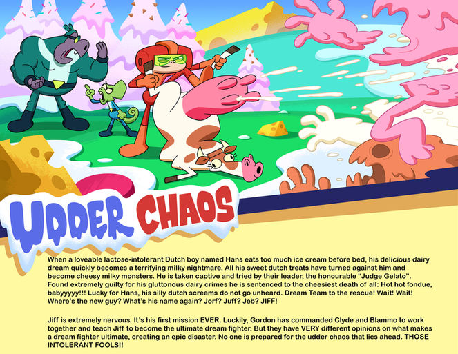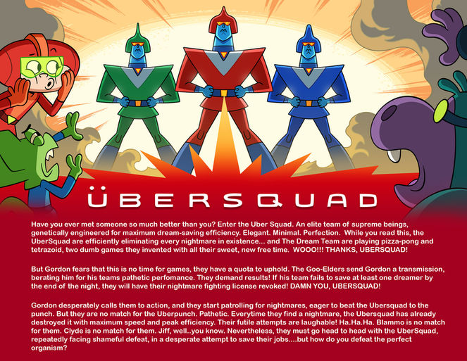 An Elite squad of Best Buds that travel through the dream world to defeat evil nightmares. Every episode, their leader GOR-DON, an all-knowing blob of goo, detects a nightmare and sends the team to do what they do best: terminate it...with ULTRAFORCE!!